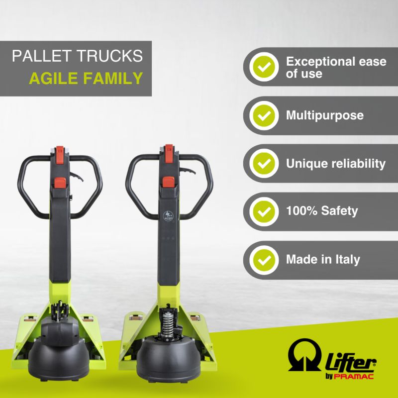 Découvrez l’AGILE EVO, le transpalette électrique conçu pour faciliter le transport de marchandises. Compact, léger et facile à utiliser, il optimise l’efficacité et la sécurité, idéal pour les livraisons, supermarchés et entrepôts. Le transpalette peut être adapter selon vos besoins. Dimensions de fourches variables. Transpalette 100% électrique ou avec levée manuel. Transpalette en acier ou en inox. Disponible avec une fonction de pesage ou en haute levée (transpalette ciseaux)